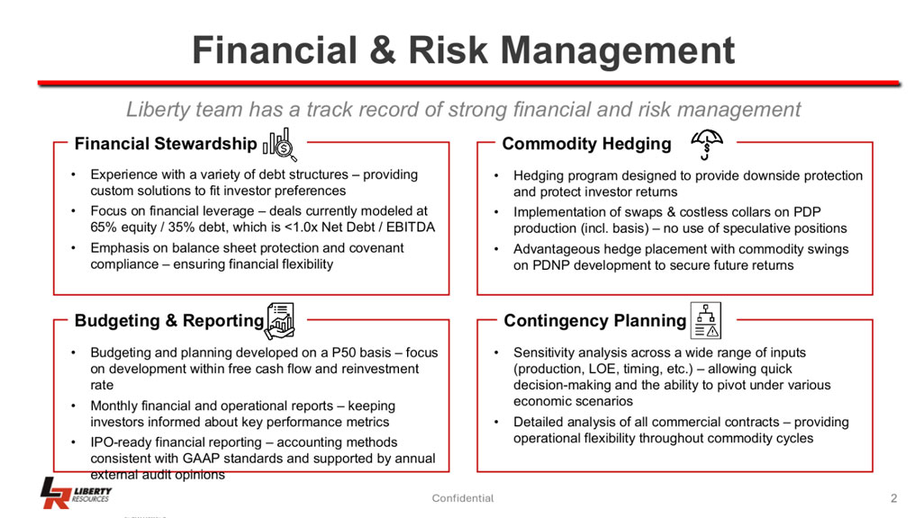From 2014-2024, the management team operated under Liberty Resources II, LLC with three operating companies: Liberty Resources Bakken Development, Liberty Resources Powder River Basin and Liberty Midstream Solutions. In the Bakken, the company acquired ~85,000 net acres, drilled and completed 120 wells while growing gross production to over 20,000 boepd. From 2015-2018, in the Powder River Basin, the company acquired ~19,000 net acres, drilled 3 modern unconventional wells and sold the asset to a private equity fund. And in Liberty Midstream Solutions the company built a 90-mile water and gas gathering system connected to a 30 MMscfd gas processing facility and four water disposal facilities capable of handling 60,000 bwpd. The company sold all the Bakken assets of Liberty Resources II and the Liberty Midstream Solutions company in March, 2024; completing a transition services agreement to the acquirer at the end of the year.